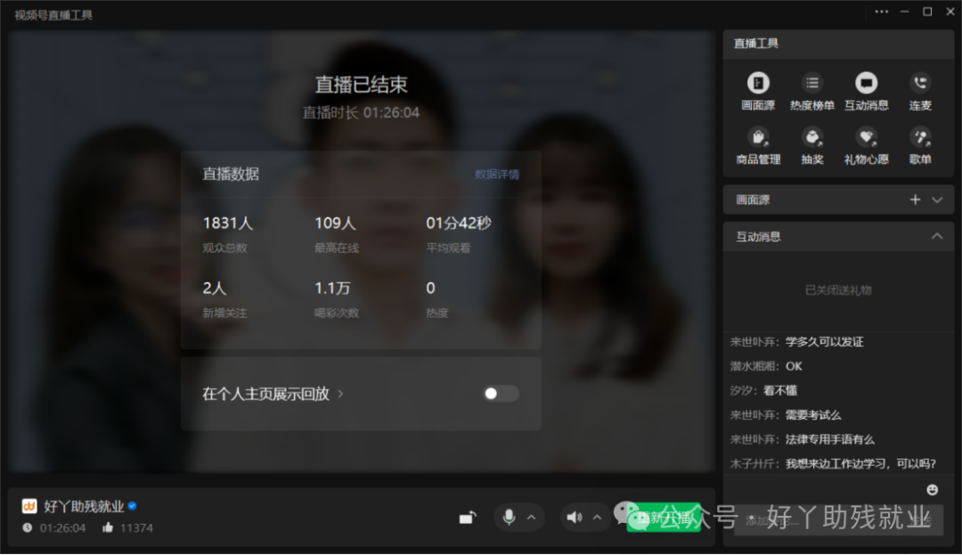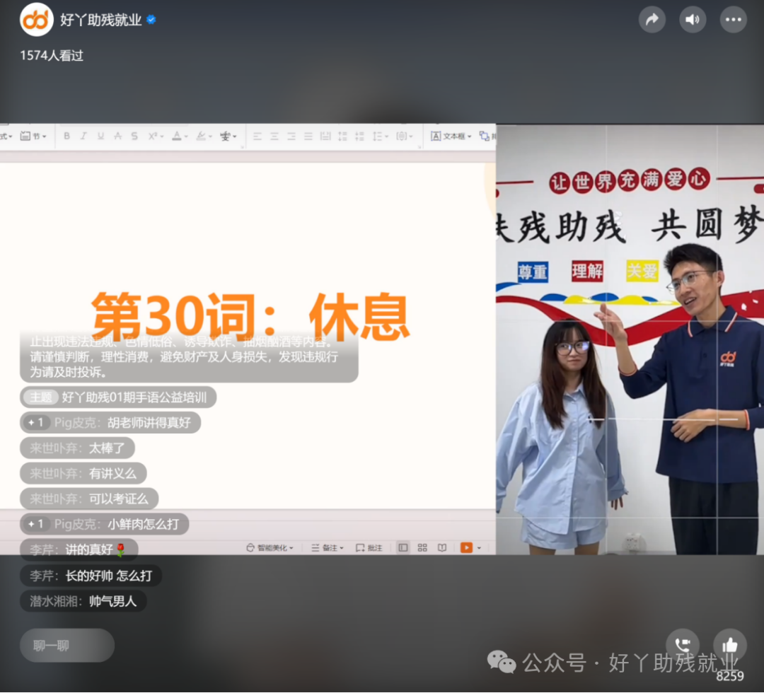 3月30日晚上19:00线上直播正式开始,1831人参与到这场公益培训中来。直播中胡老师为大家做了30个日常生活、30个工作求职的手语词汇以及20条词汇组合句子的教学,好丫助残聋人金牌主播鱼鱼和银牌主播嘉嘉为大家做词汇句子的手语演示,并与直播间的朋友进行了实时互动。