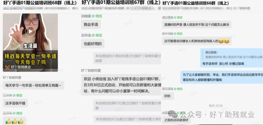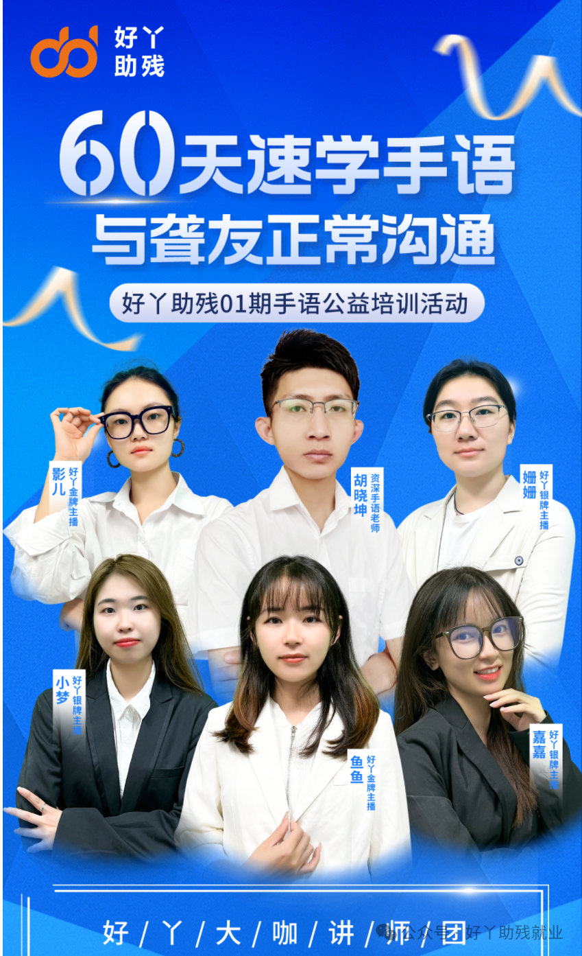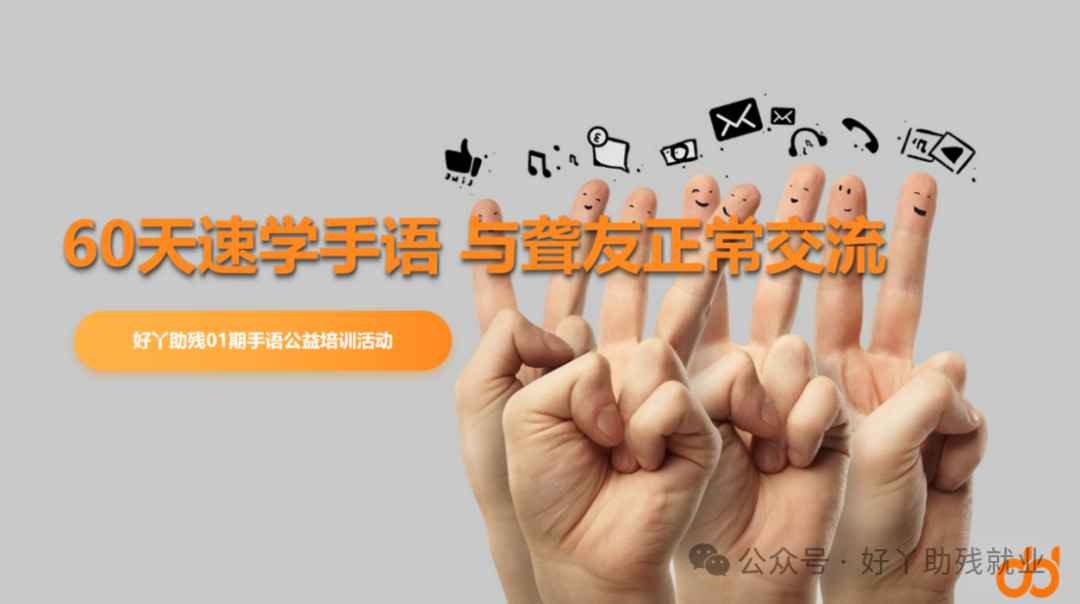 化障碍为大爱,为更好帮助聋人与健全人建立沟通桥梁,高质量推进残疾人就业,促进残疾人事业全面发展。2024年3月30日,由好丫助残就业服务(深圳)有限公司主办为期60天的好丫助残01期手语公益培训线上直播活动正式开始。