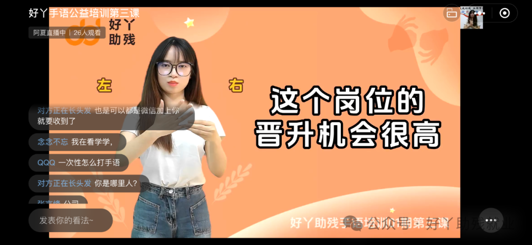 为了帮助聋友和健全人朋友,解决沟通障碍,并且在聋友找工作过程中,提供帮助。2024年,4月13日晚上19:00,由好丫金牌主播嘉嘉给聋友们做了好丫手语公益培训01期第三课-工作日常的教学,围绕工作日常60个单词和20个经典句子,老师分别做了两次以上的精彩教学。